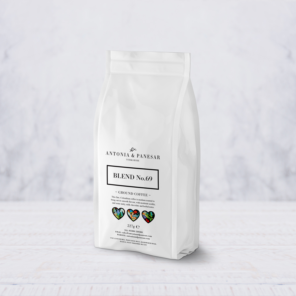 Limited Edition Blend No.69 Ground Coffee Bag 227g – This fine, big bean Colombian coffee from the Risaralda area of the Central region of Colombia is medium roasted to bring out its smooth flavour, with moderate acidity, and some nutty, milk chocolate and herbal notes.